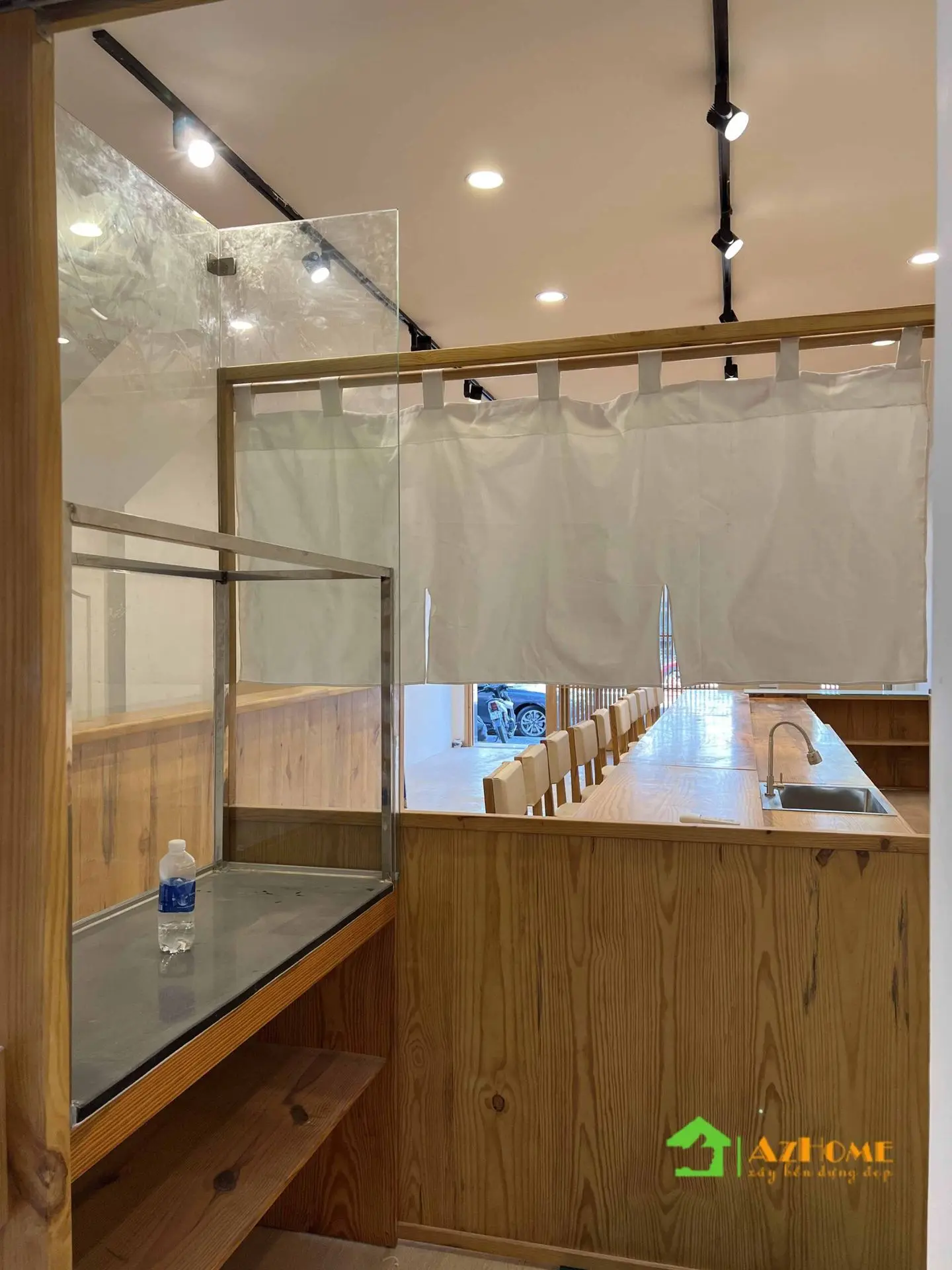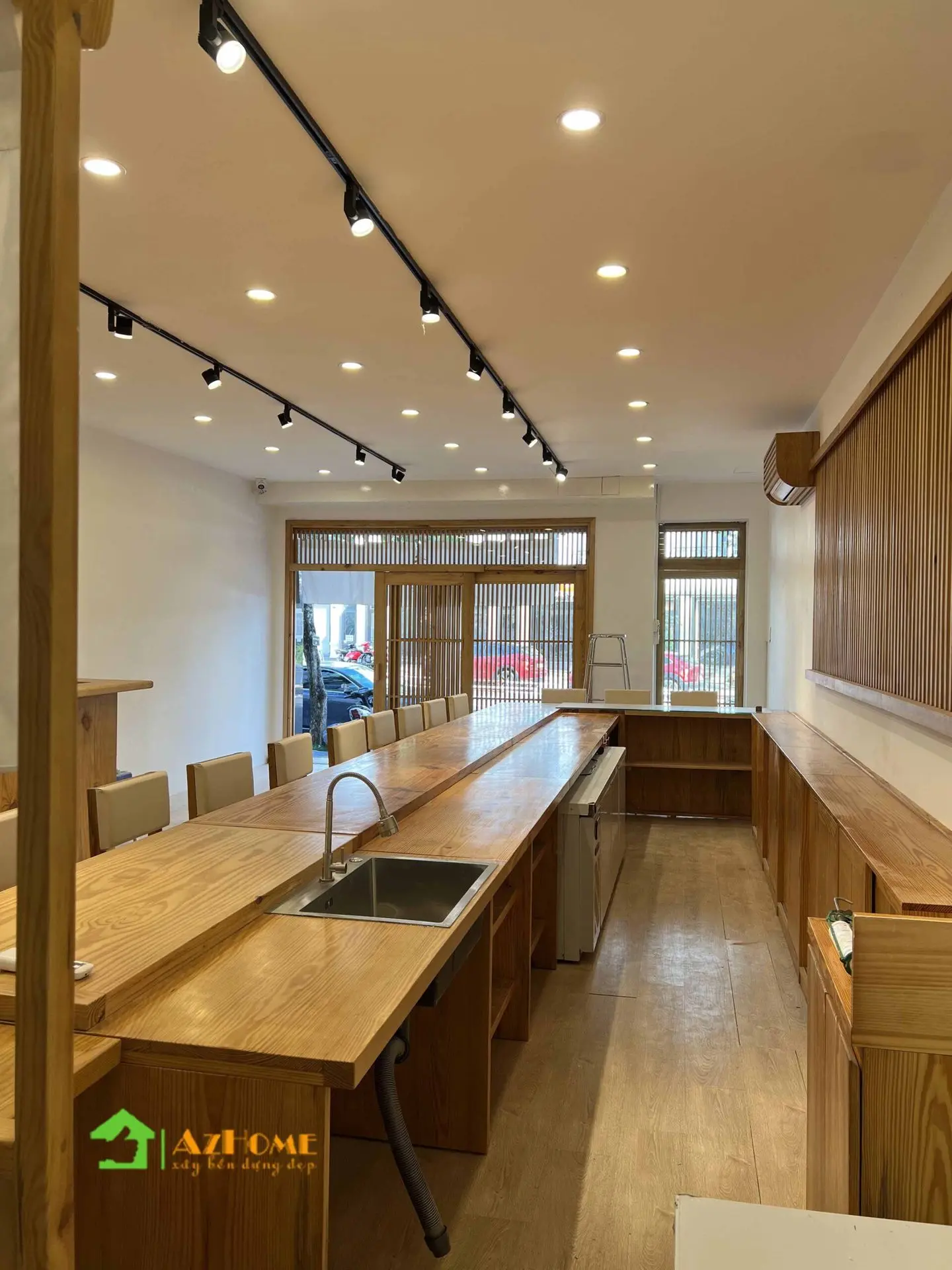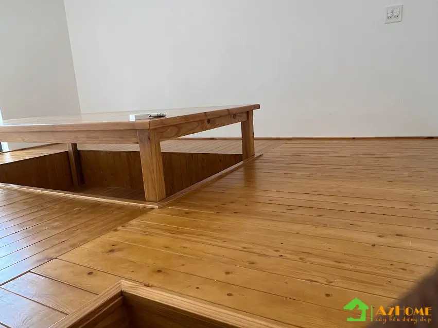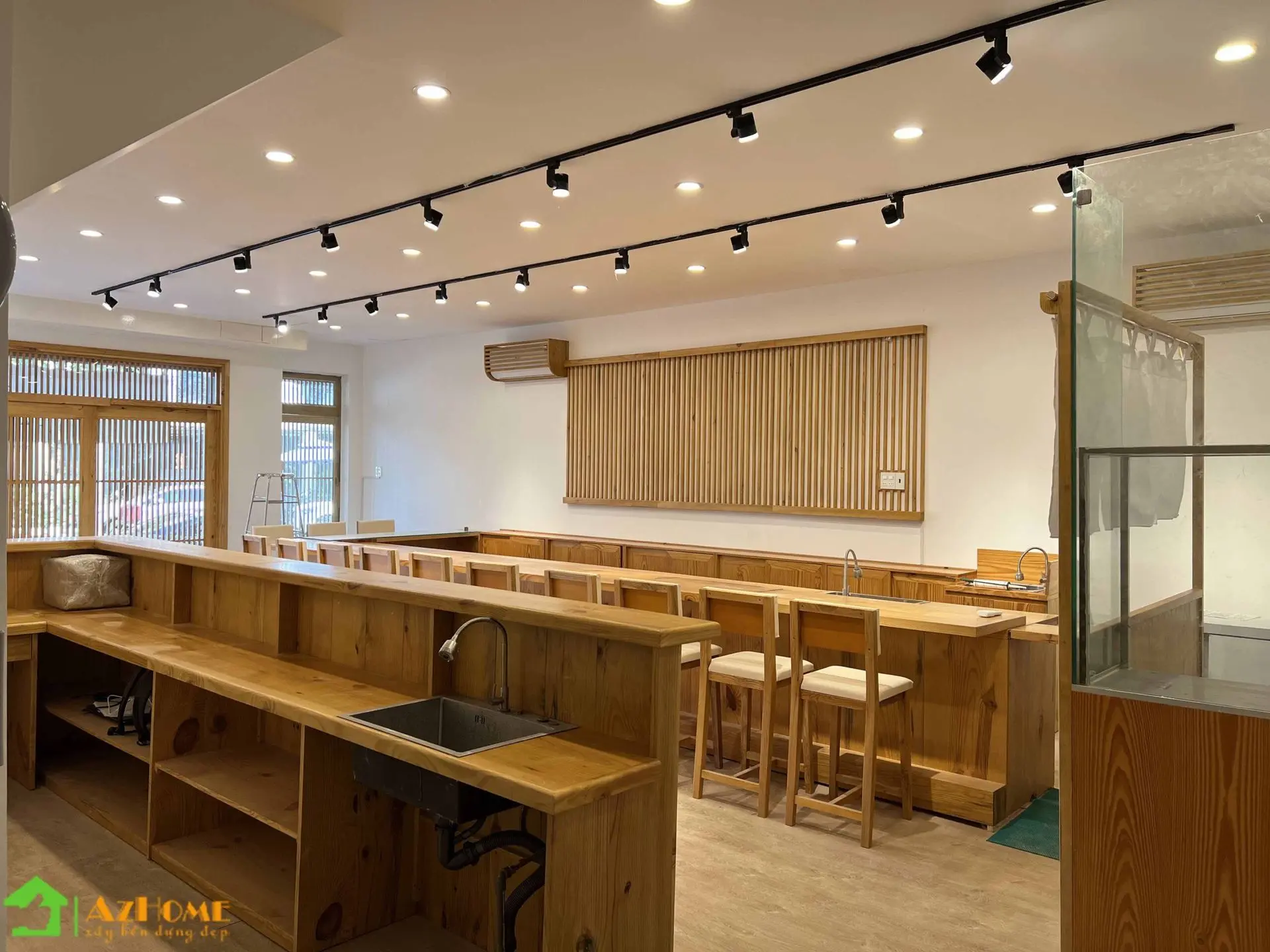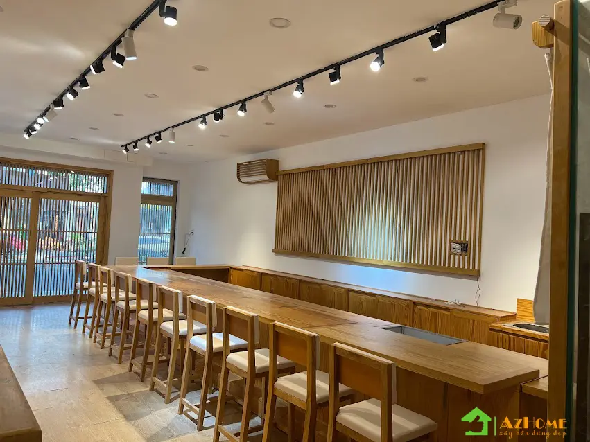 Chất liệu có màu sắc ấm ấp nhưng với giá thành 'mềm' nhất đó chính là gỗ thông. Vì vậy mà nhiều khách hàng đã chọn gỗ thông cho không gian nội thất nhà hàng theo phong cách Nhật Bản. Với quầy Sushi dài, bục gỗ phòng Tatami, cửa sổ, cửa đi, vách trang trí 'ca rô' kiểu Nhật... tiêu tốn khối lượng gỗ rất lớn; Nên khi sử dụng gỗ thông sẽ tiết kiệm một khoản chi phí đáng kể cho nhà hàng khi bắt đầu kinh doanh.