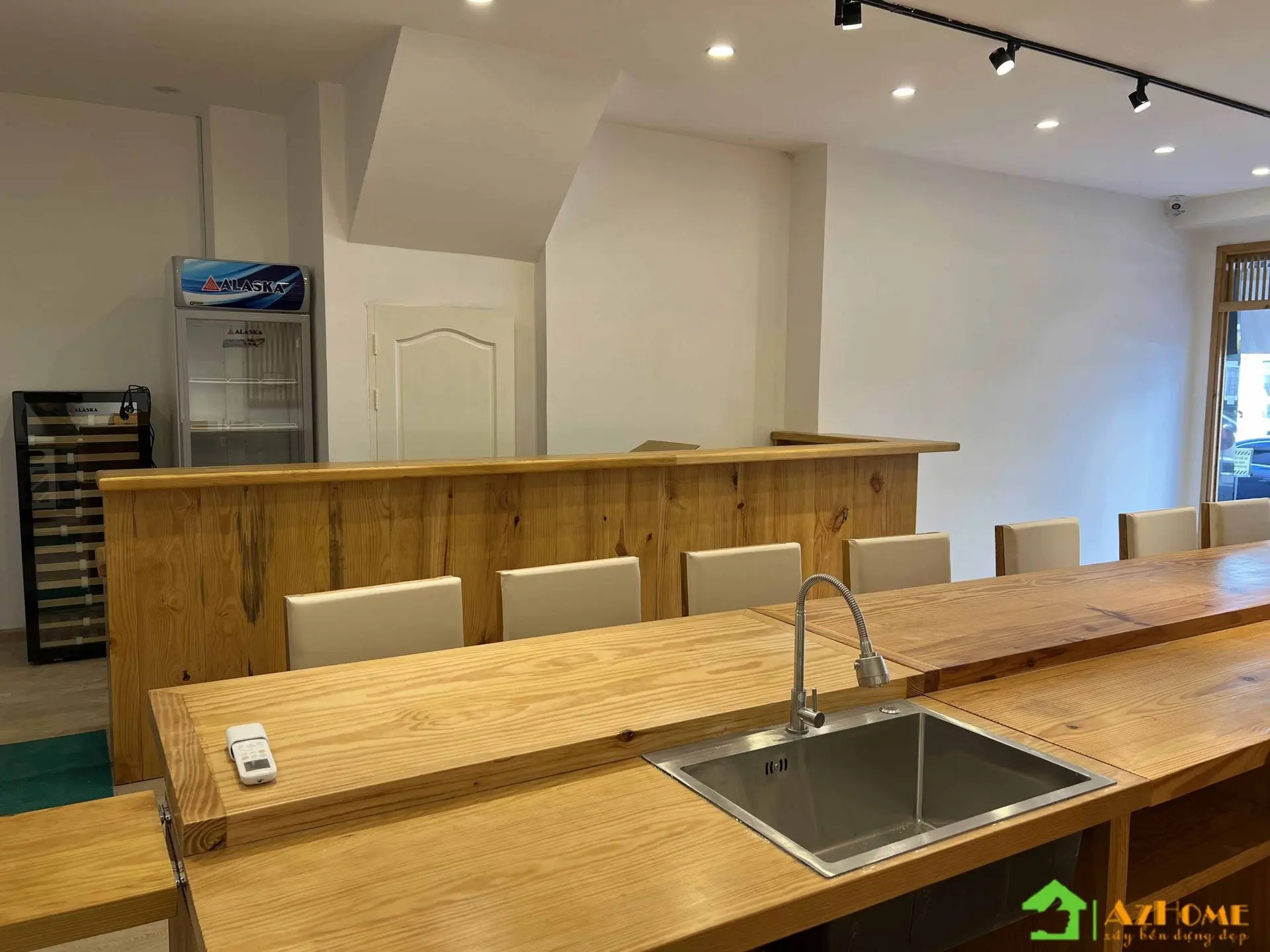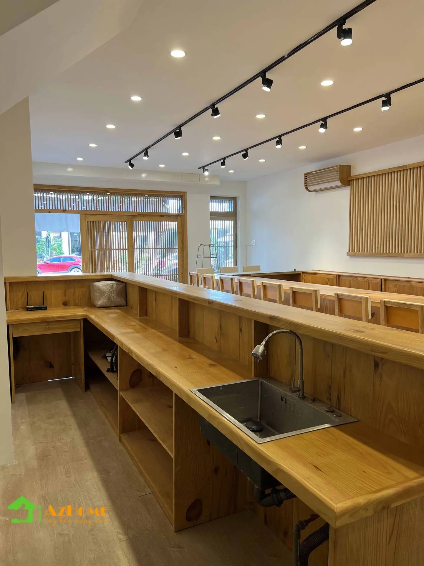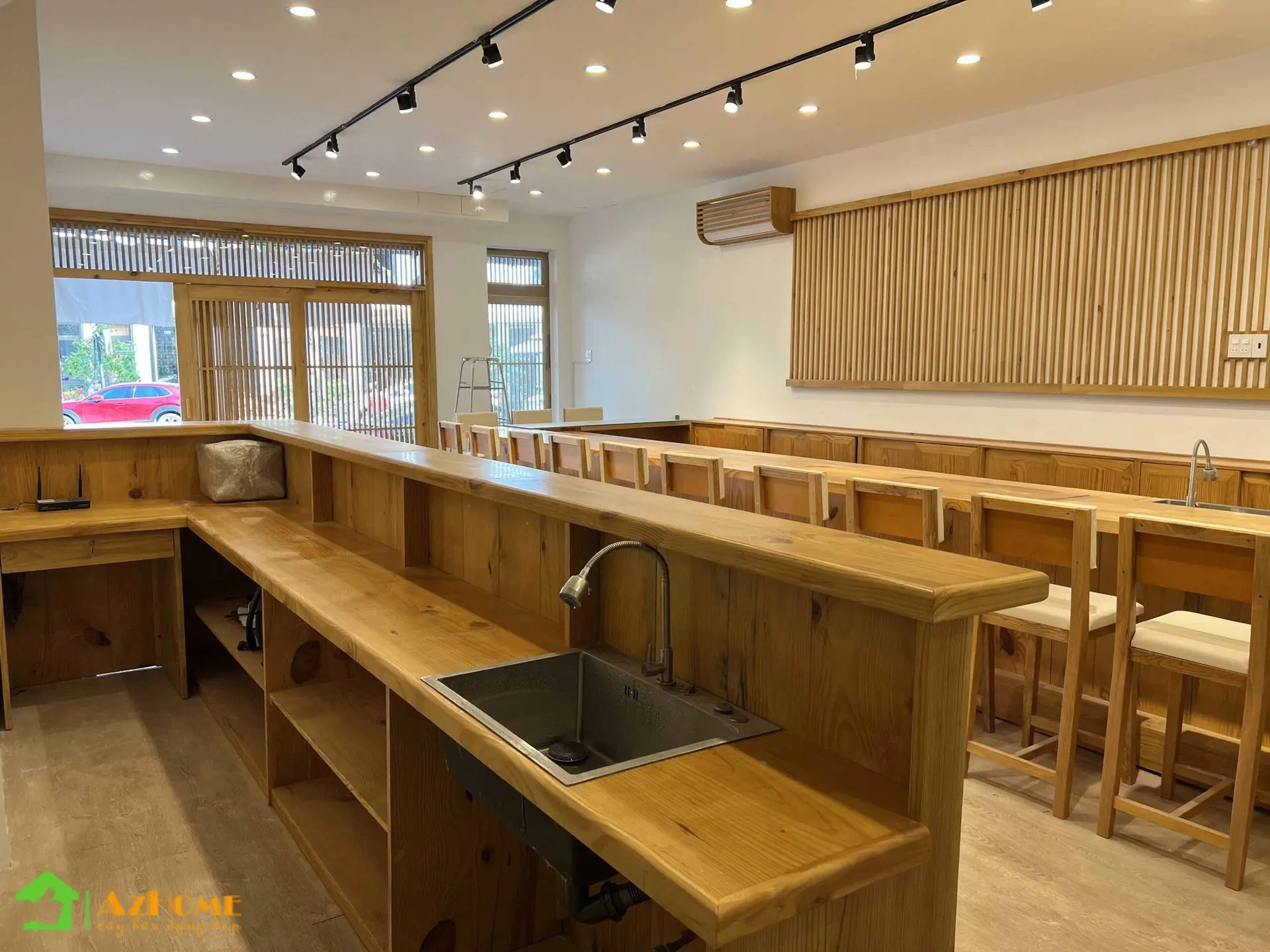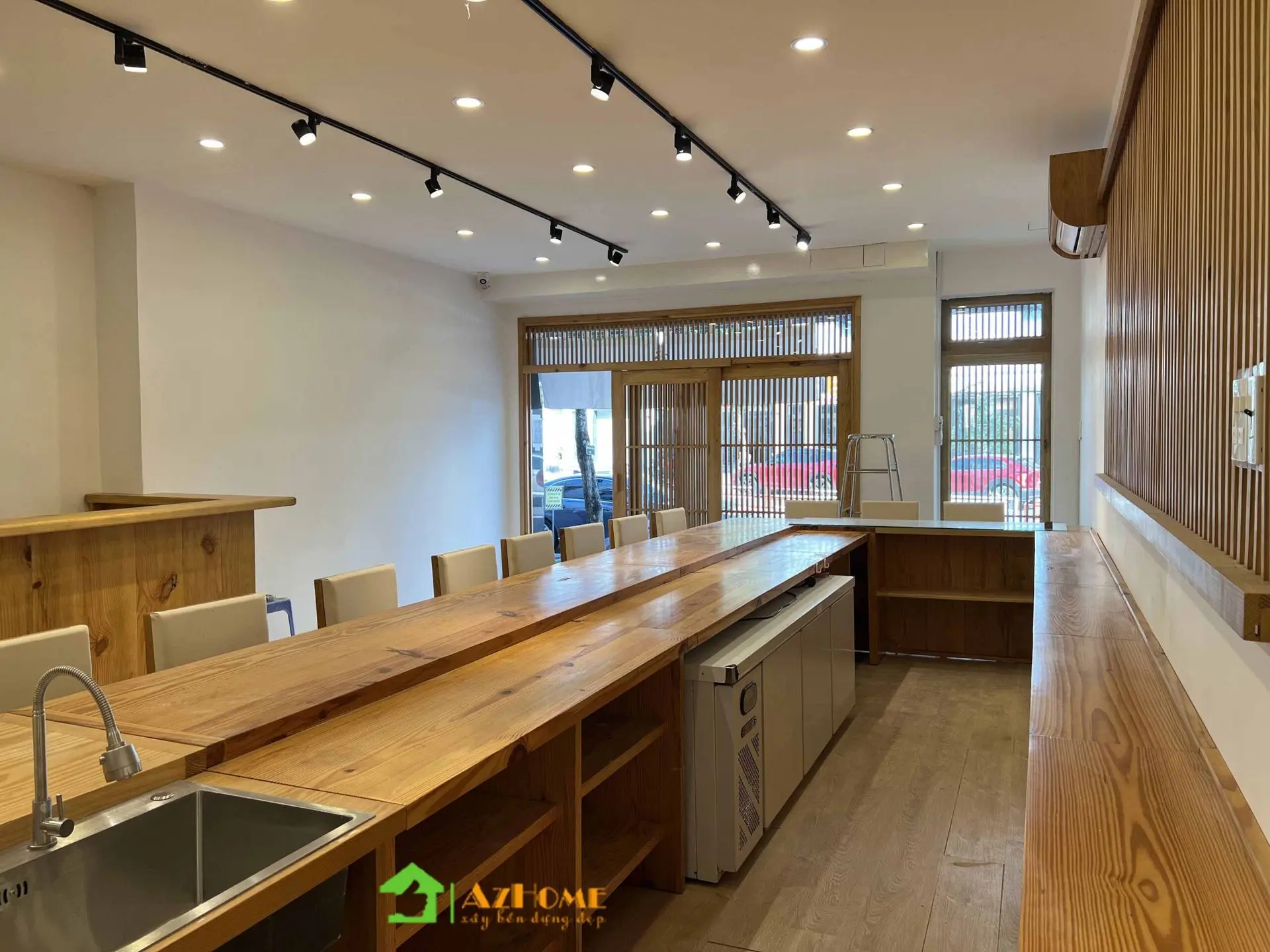 Chất liệu có màu sắc ấm ấp nhưng với giá thành 'mềm' nhất đó chính là gỗ thông. Vì vậy mà nhiều khách hàng đã chọn gỗ thông cho không gian nội thất nhà hàng theo phong cách Nhật Bản. Với quầy Sushi dài, bục gỗ phòng Tatami, cửa sổ, cửa đi, vách trang trí 'ca rô' kiểu Nhật... tiêu tốn khối lượng gỗ rất lớn; Nên khi sử dụng gỗ thông sẽ tiết kiệm một khoản chi phí đáng kể cho nhà hàng khi bắt đầu kinh doanh.